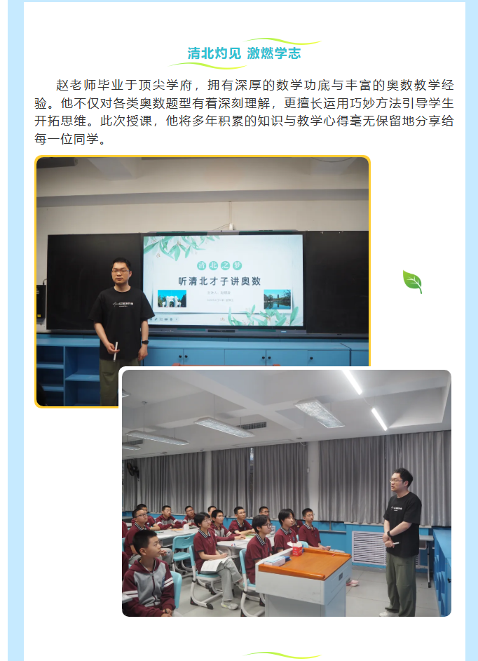 初中部 | 清北星光 · 奥数逐梦之旅继第三届数学思维王挑战赛之后,校园里又掀起了一阵智慧的浪潮 —— 清北名师讲奥数活动!初中部清北教师赵朝旋老师走进课堂,为同学们带来了一场别开生面的奥数知识盛宴,带领大家在数学的奇妙世界中探索遨游。此次清北名师讲奥数活动,不仅为同学们带来了宝贵的知识和独特的解题技巧,更