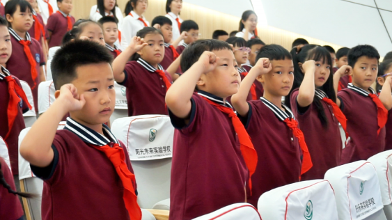 在鲜艳的队旗下,新少先队员们身姿挺拔,齐声庄严宣誓,每一句誓词都如钟鸣般铿锵有力,